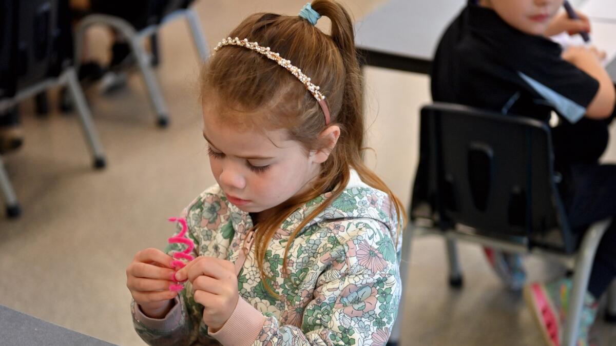 Pipe dream: Peyton Bailey, 5, threading some beads onto a pipe cleaner.