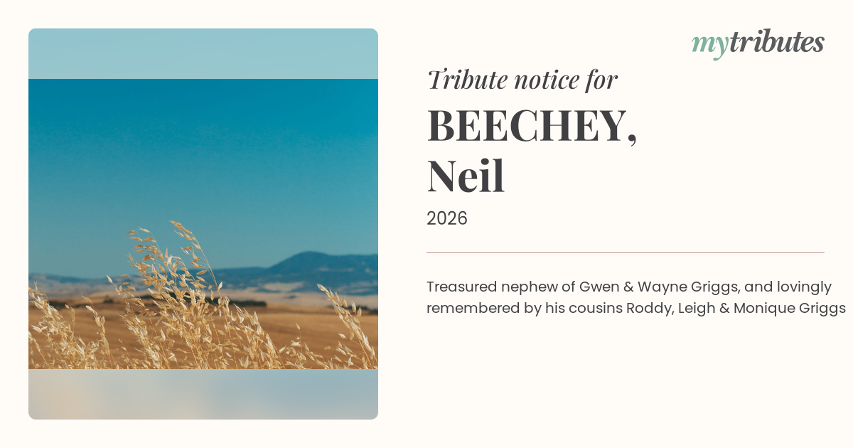 17°CTreasured nephew of Gwen & Wayne Griggs, and lovingly remembered by his cousins Roddy, Leigh & Monique Griggs