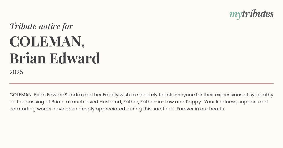 Sandra and her Family wish to sincerely thank everyone for their expressions of sympathy on the passing of Brian — a much loved Husband, Father, Father-in-Law and Poppy. Your kindness, support and comforting words have been deeply appreciated during this sad time.