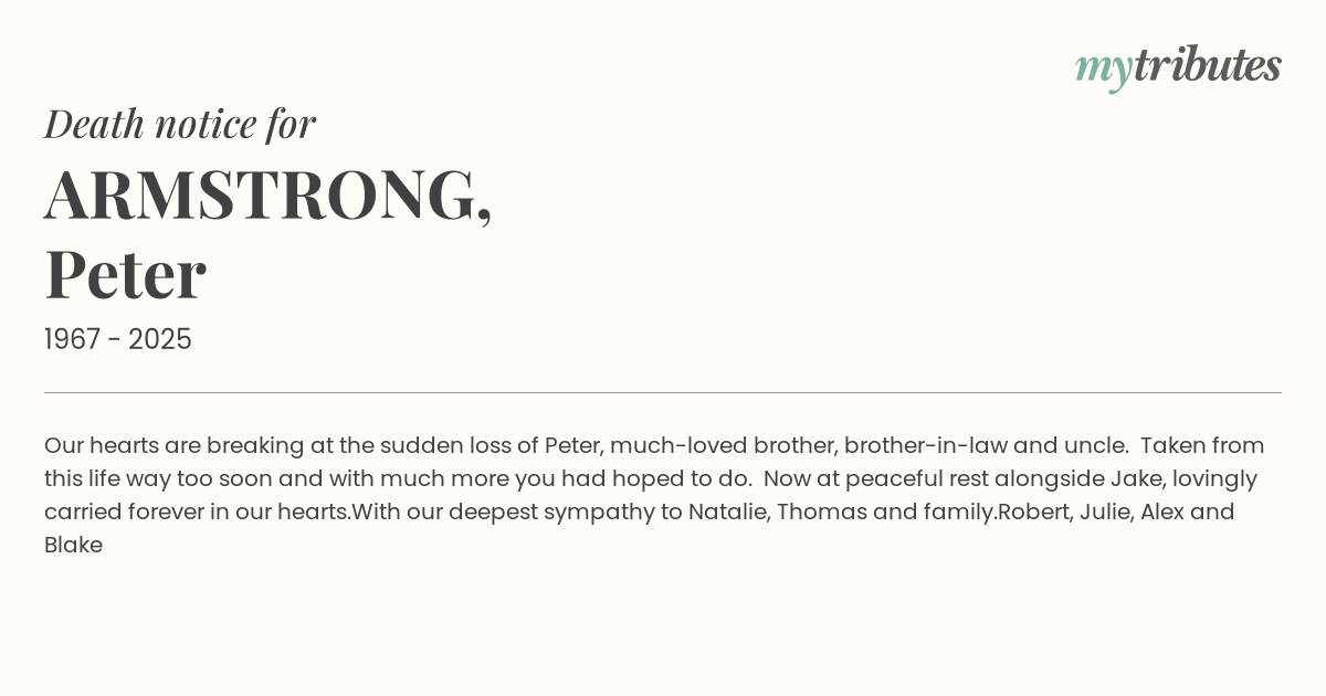 17°COur hearts are breaking at the sudden loss of Peter, much-loved brother, brother-in-law and uncle. Taken from this life way too soon and with much more you had hoped to do. Now at peaceful rest alongside Jake, lovingly carried forever in our hearts.