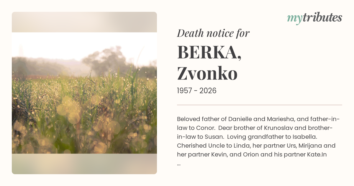17°CBeloved father of Danielle and Mariesha, and father-in-law to Conor. Dear brother of Krunoslav and brother-in-law to Susan. Loving grandfather to Isabella. Cherished Uncle to Linda, her partner Urs, Mirijana and her partner Kevin, and Orion and his partner Kate.