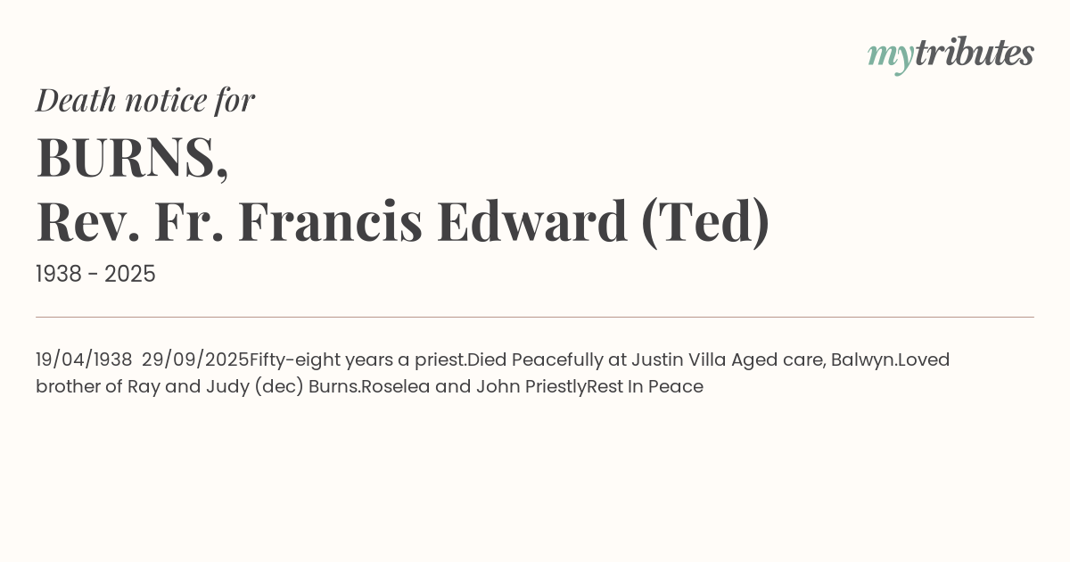 Died Peacefully at Justin Villa Aged care, Balwyn.