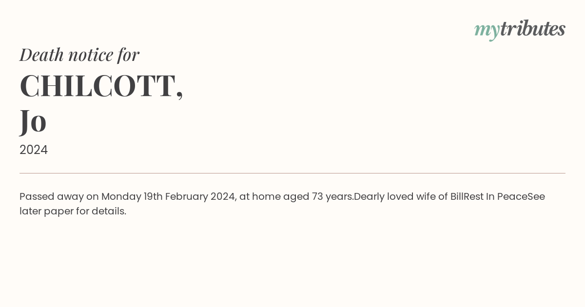 17°CPassed away on Monday 19th February 2024, at home aged 73 years.