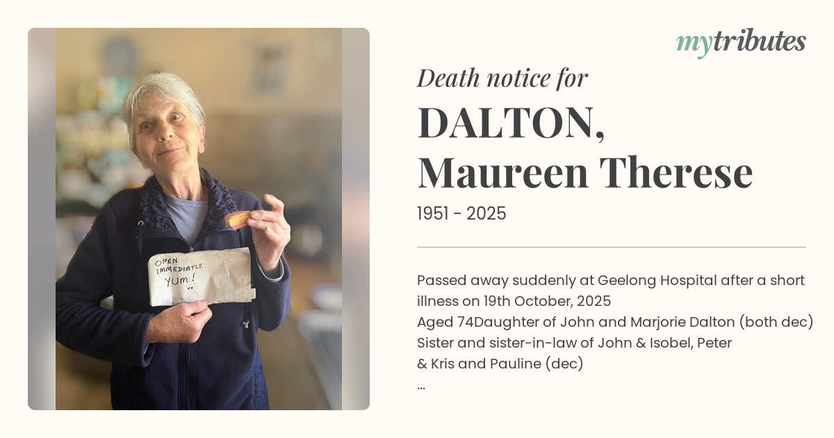 Daughter of John and Marjorie Dalton (both dec) Sister and sister-in-law of John & Isobel, Peter & Kris and Pauline (dec) Cousin of Paul and friend of Carol Maureen was also a loved aunt.