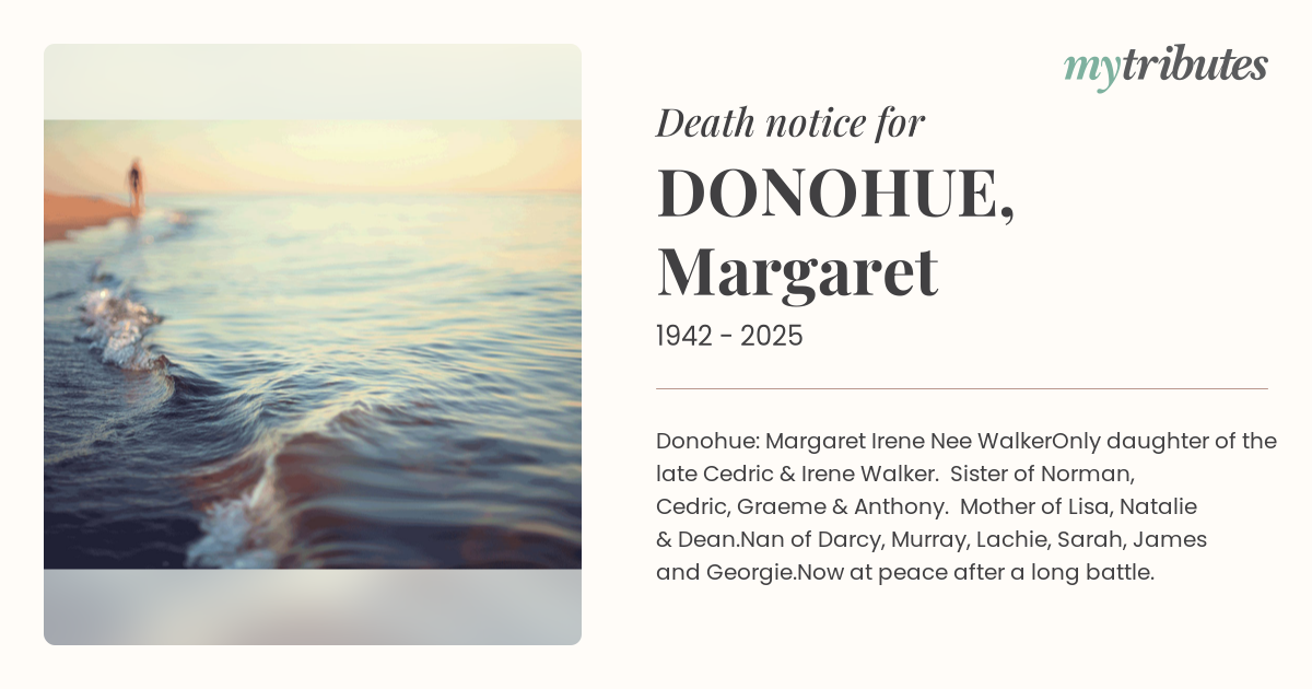 Only daughter of the late Cedric & Irene Walker. Sister of Norman, Cedric, Graeme & Anthony. Mother of Lisa, Natalie & Dean.