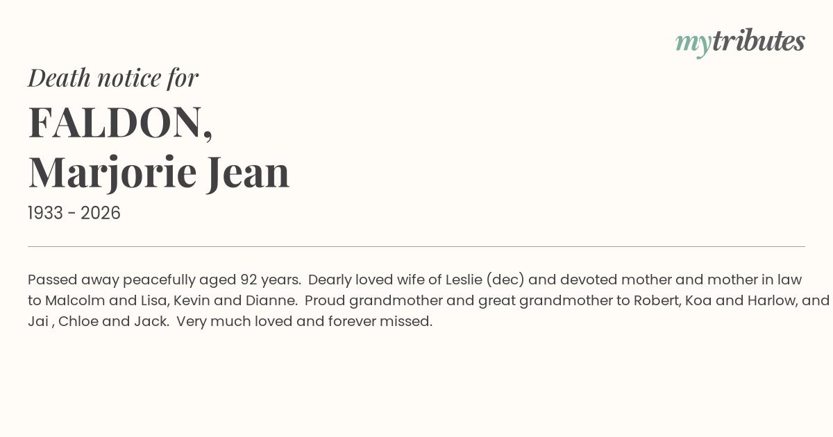 17°CPassed away peacefully aged 92 years. Dearly loved wife of Leslie (dec) and devoted mother and mother in law to Malcolm and Lisa, Kevin and Dianne. Proud grandmother and great grandmother to Robert, Koa and Harlow, and Jai , Chloe and Jack. Very much loved and forever missed.