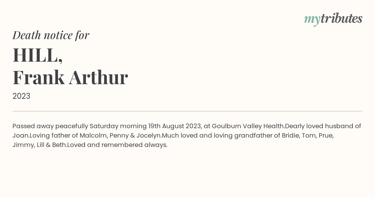 17°CPassed away peacefully Saturday morning 19th August 2023, at Goulburn Valley Health.