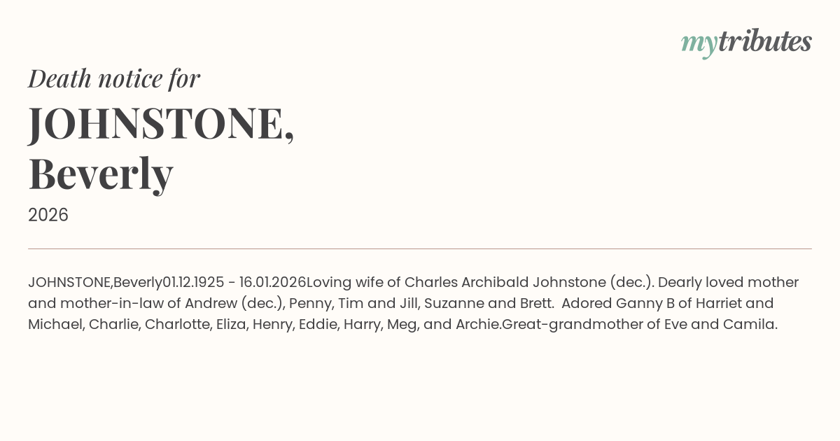Loving wife of Charles Archibald Johnstone (dec.). Dearly loved mother and mother-in-law of Andrew (dec.), Penny, Tim and Jill, Suzanne and Brett. Adored Ganny B of Harriet and Michael, Charlie, Charlotte, Eliza, Henry, Eddie, Harry, Meg, and Archie.