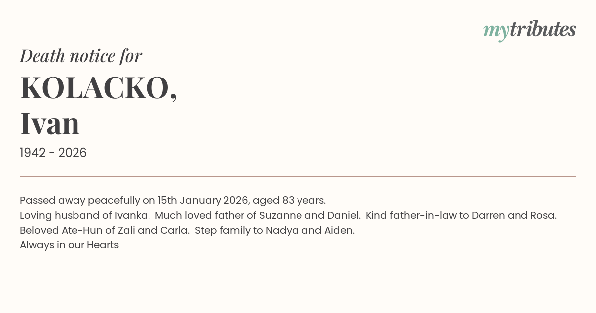 17°CPassed away peacefully on 15th January 2026, aged 83 years.