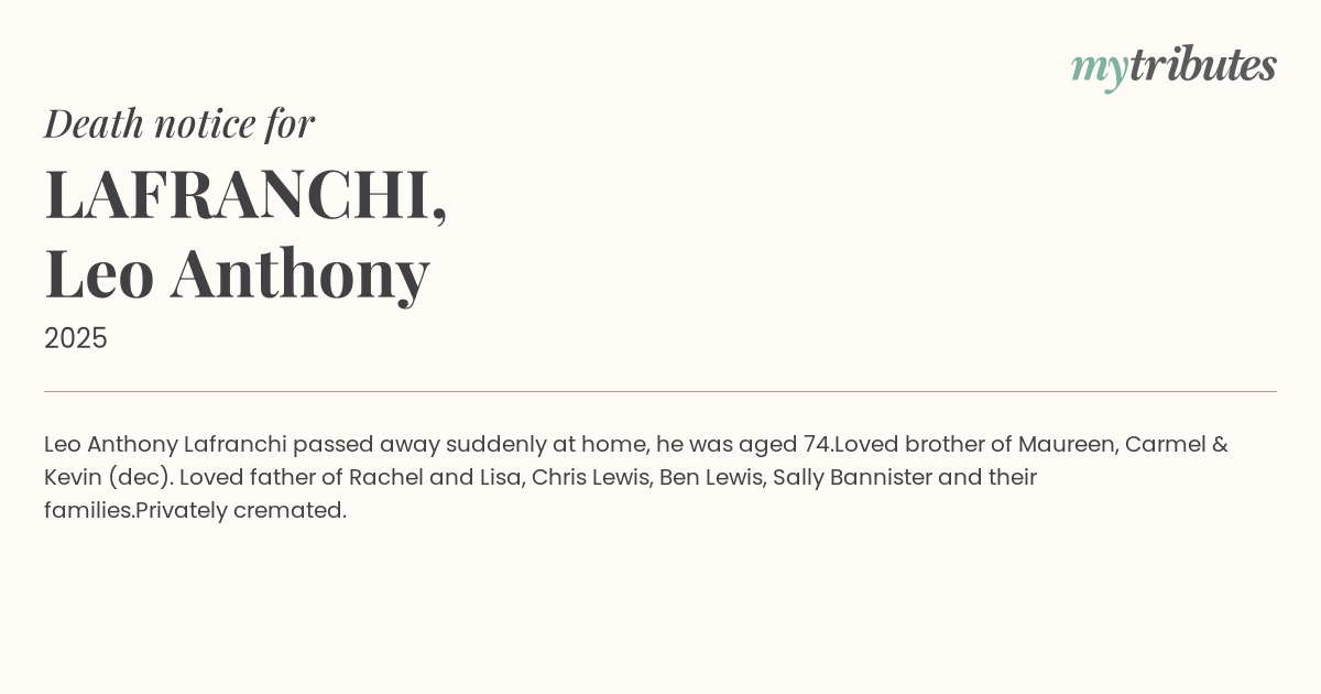 17°CLeo Anthony Lafranchi passed away suddenly at home, he was aged 74.