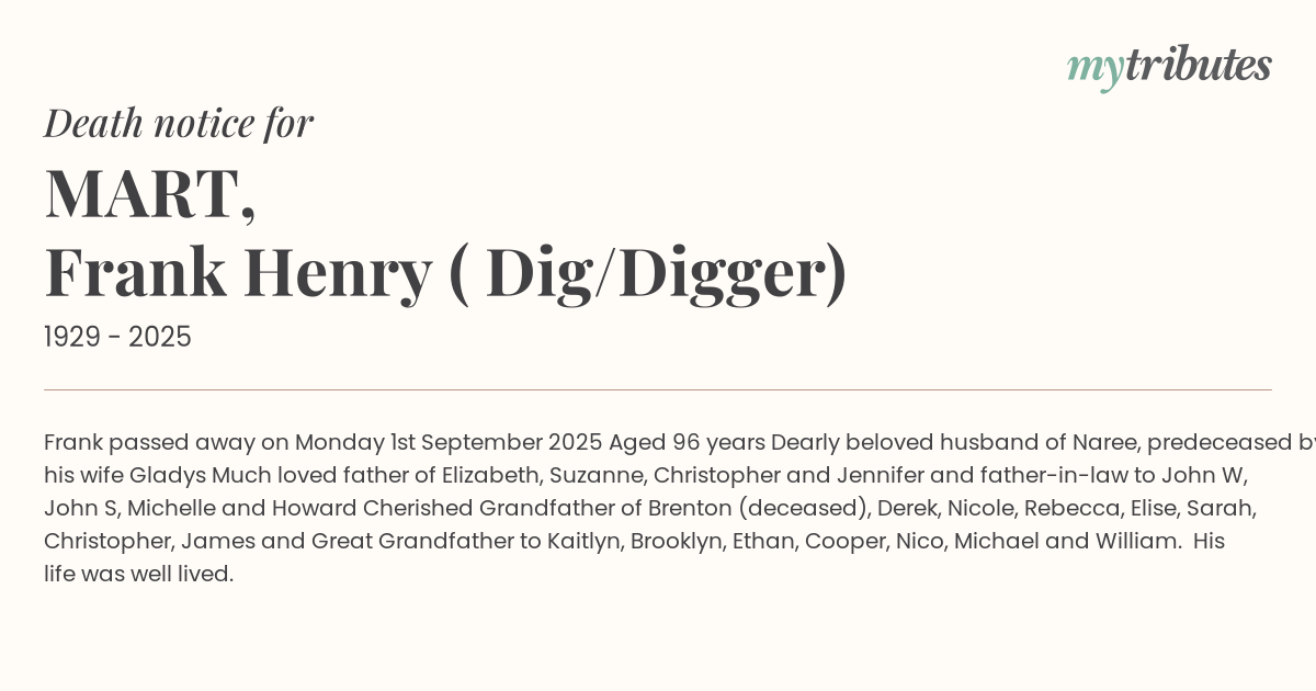17°CFrank passed away on Monday 1st September 2025 Aged 96 years Dearly beloved husband of Naree, predeceased by his wife Gladys Much loved father of Elizabeth, Suzanne, Christopher and Jennifer and father-in-law to John W, John S, Michelle and Howard Cherished Grandfather of Brenton (deceased), Derek, Nicole, Rebecca, Elise, Sarah, Christopher, James and Great Grandfather to Kaitlyn, Brooklyn, Ethan, Cooper, Nico, Michael and William. His life was well lived.