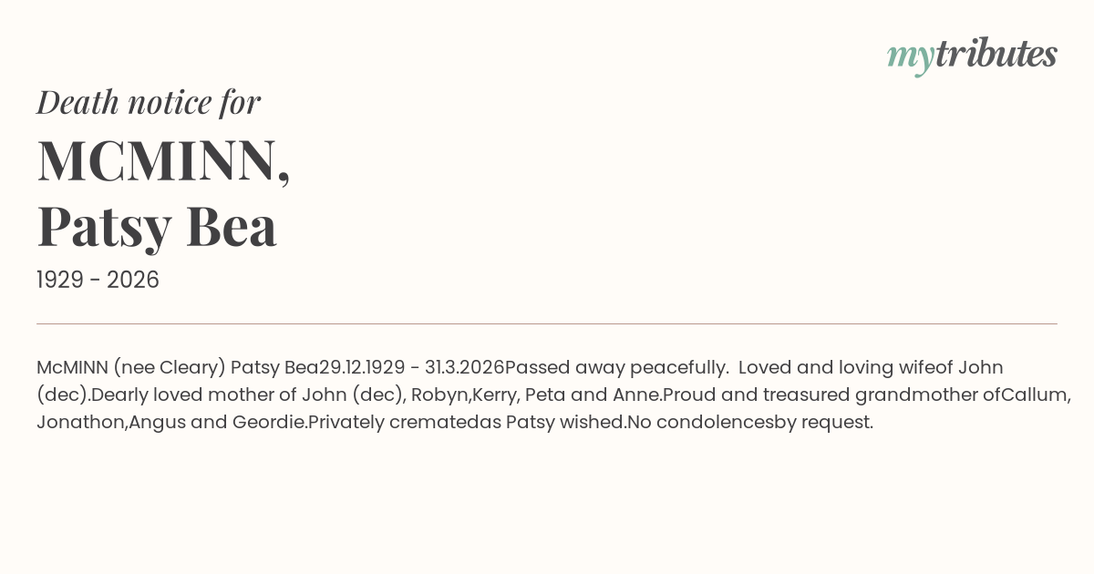 17°CMcMINN (nee Cleary) Patsy Bea