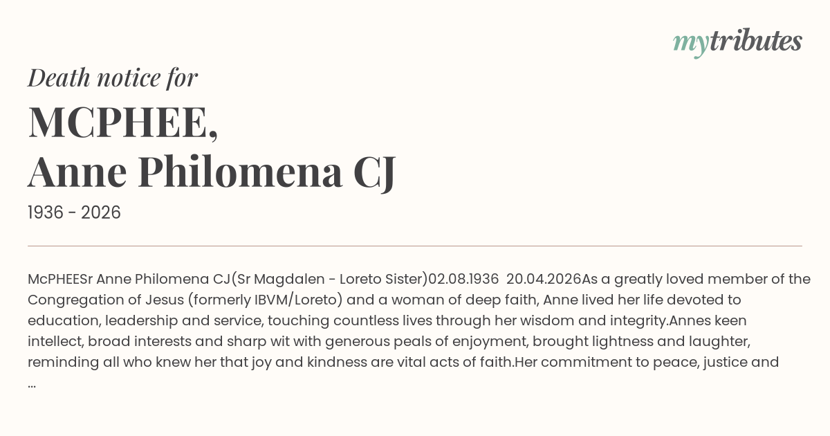 Anne died peacefully at St Vincent’s Aged Care Hawthorn, Victoria on Monday, 20th April, 2026