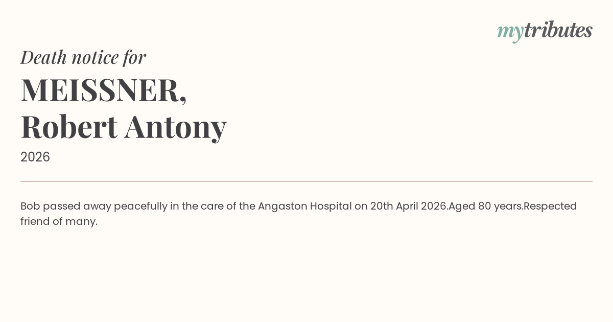 17°CBob passed away peacefully in the care of the Angaston Hospital on 20th April 2026.