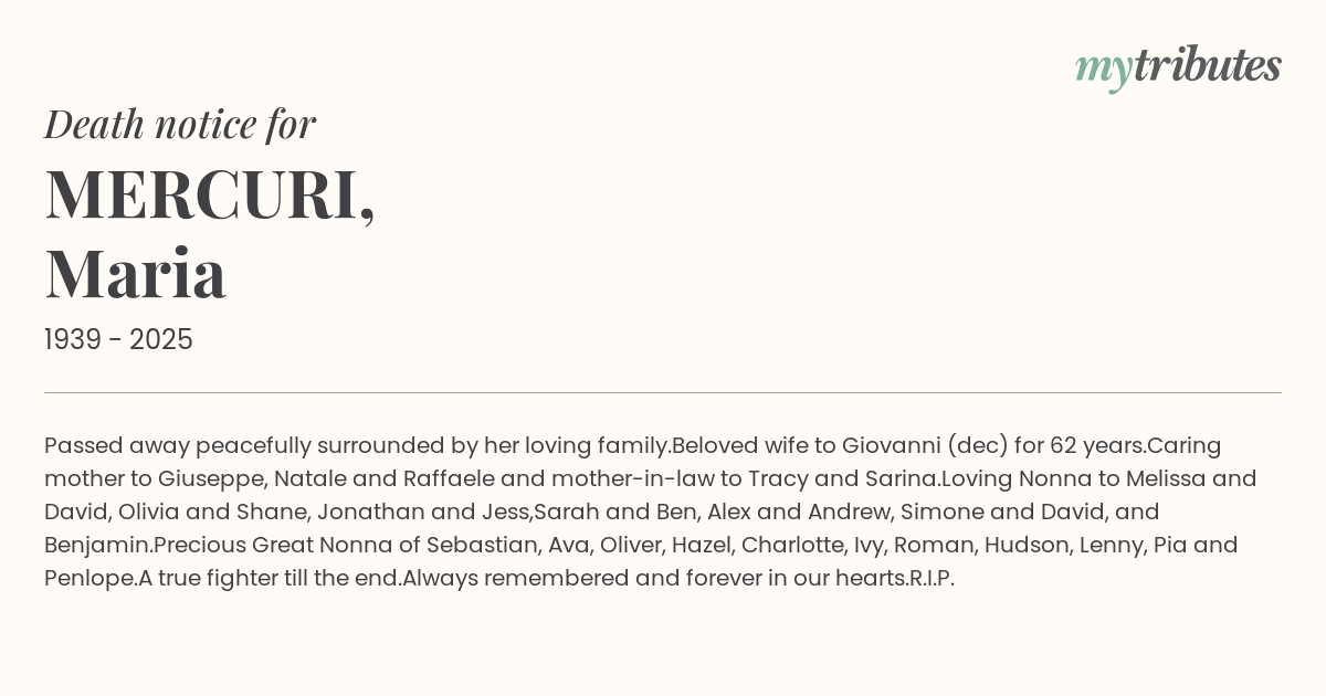 Caring mother to Giuseppe, Natale and Raffaele and mother-in-law to Tracy and Sarina.
