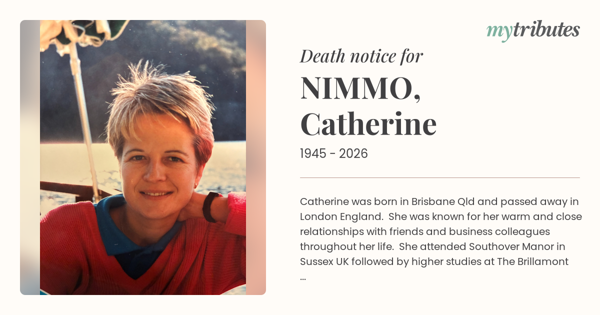 17°CCatherine was born in Brisbane Qld and passed away in London England. She was known for her warm and close relationships with friends and business colleagues throughout her life. She attended Southover Manor in Sussex UK followed by higher studies at The Brillamont Institute in Lausanne Switzerland. She carved out a successful career as the co-owner of Nimmo & Spooner in Lillie Rd. London, a renowned shop offering distinctive 18th to 20th century home furnishings. Beyond her professional life Cathy loved to travel. She returned to Australia for several years as a young woman. Later in life she frequently vacationed in Rhodes and often visited France on buying trips. She was also a dedicated godmother and aunt, involved in the lives of her godchildren and nephew Russell. Cathy was preceded in death by her father Lieut General R.H. Nimmo and her mother Mary Dundas Page Nimmo. She is survived by her brother Robert, her Australian cousins and her close friend Myra Spooner.
