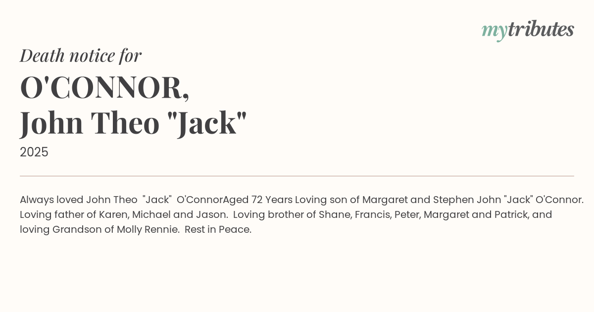 Loving son of Margaret and Stephen John "Jack" O'Connor. Loving father of Karen, Michael and Jason.