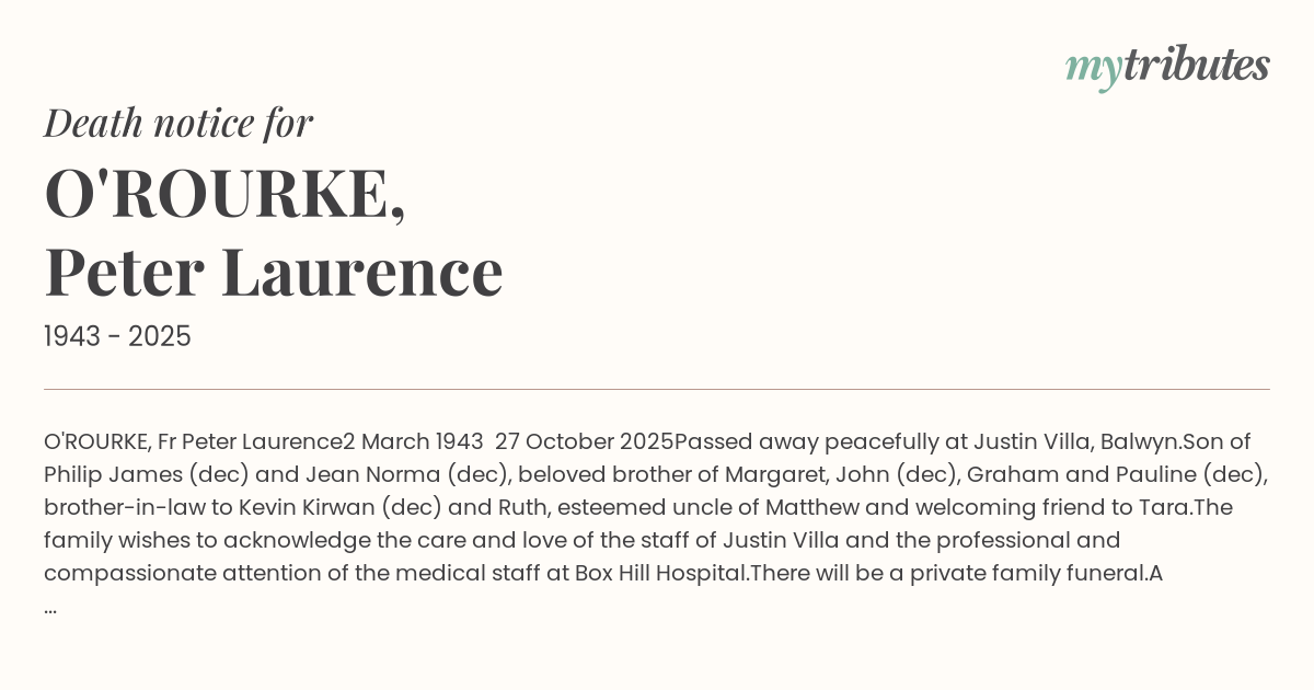 Son of Philip James (dec) and Jean Norma (dec), beloved brother of Margaret, John (dec), Graham and Pauline (dec), brother-in-law to Kevin Kirwan (dec) and Ruth, esteemed uncle of Matthew and welcoming friend to Tara.