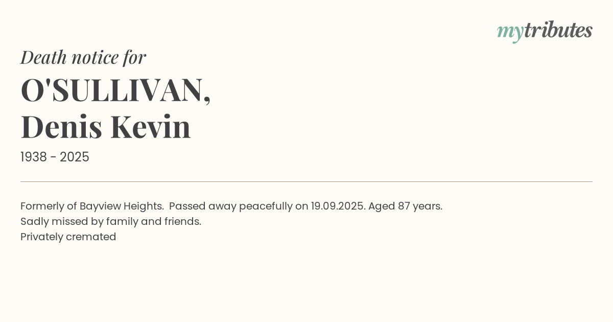 17°CFormerly of Bayview Heights. Passed away peacefully on 19.09.2025. Aged 87 years.