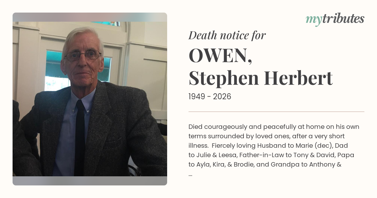 17°CDied courageously and peacefully at home on his own terms surrounded by loved ones, after a very short illness. Fiercely loving Husband to Marie (dec), Dad to Julie & Leesa, Father-in-Law to Tony & David, Papa to Ayla, Kira, & Brodie, and Grandpa to Anthony & Matilda. A good man, a generous man, a loving man. Gone far too soon, but loved forever.