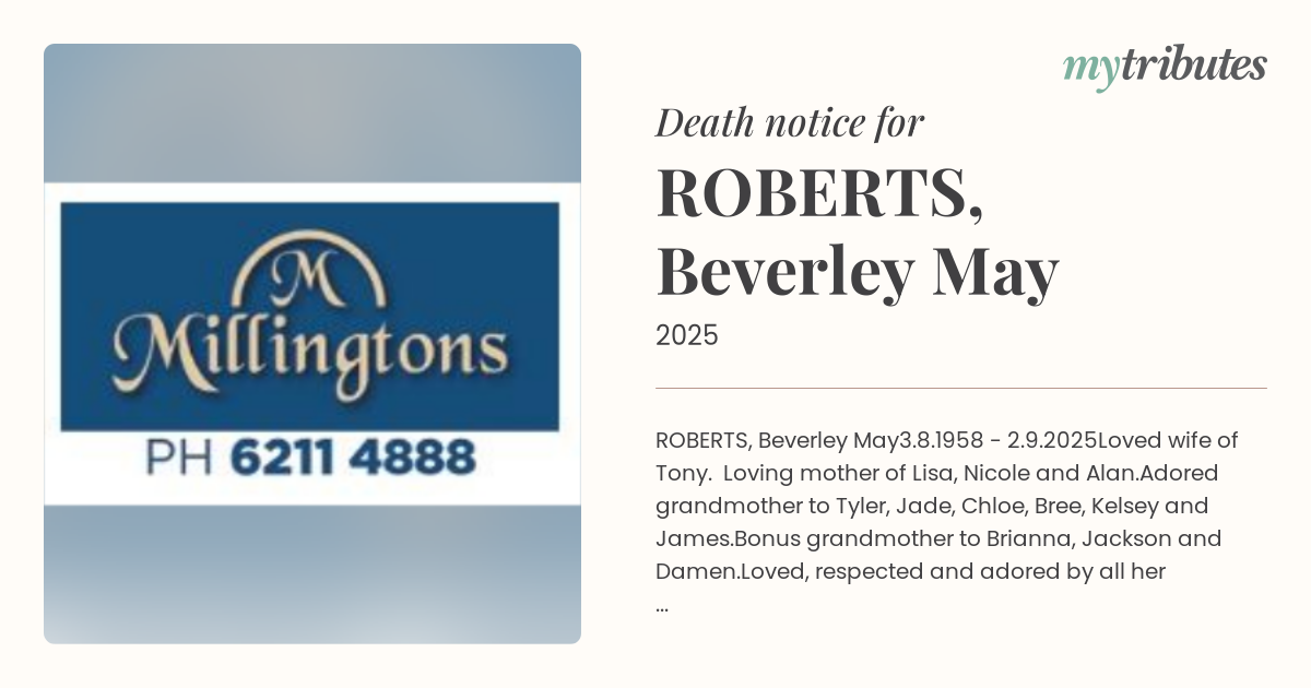 Adored grandmother to Tyler, Jade, Chloe, Bree, Kelsey and James.