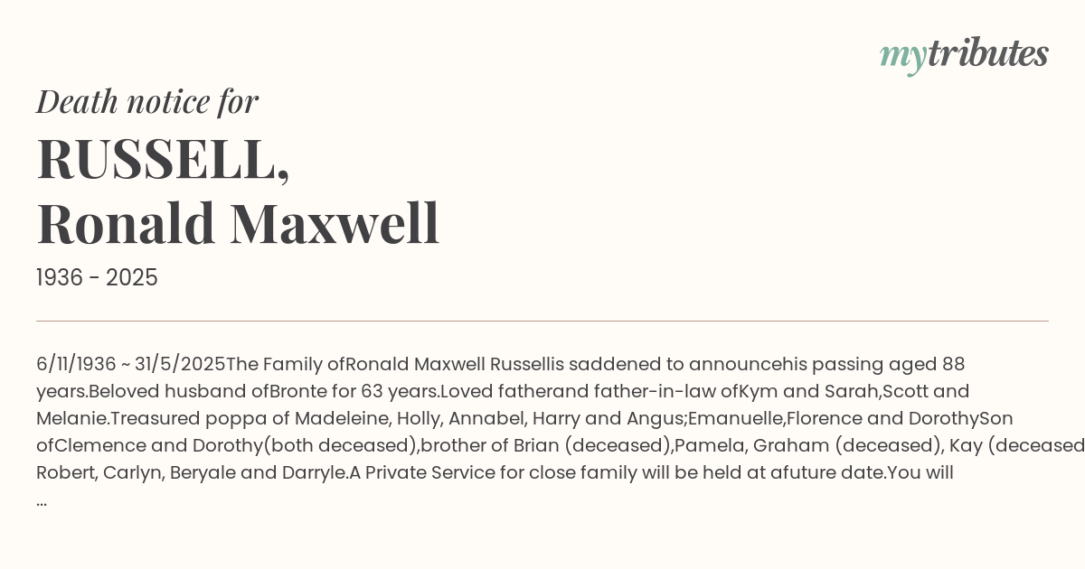 Treasured poppa of Madeleine, Holly, Annabel, Harry and Angus;