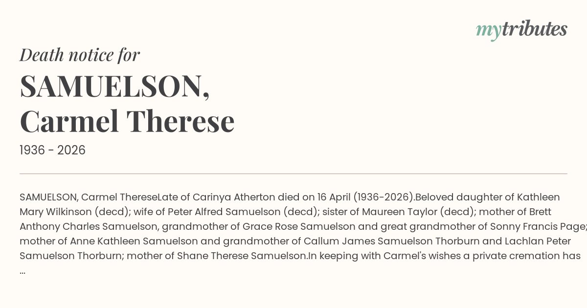 Beloved daughter of Kathleen Mary Wilkinson (decd); wife of Peter Alfred Samuelson (decd); sister of Maureen Taylor (decd); mother of Brett Anthony Charles Samuelson, grandmother of Grace Rose Samuelson and great grandmother of Sonny Francis Page; mother of Anne Kathleen Samuelson and grandmother of Callum James Samuelson Thorburn and Lachlan Peter Samuelson Thorburn; mother of Shane Therese Samuelson.