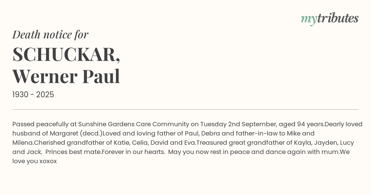 17°CPassed peacefully at Sunshine Gardens Care Community on Tuesday 2nd September, aged 94 years.