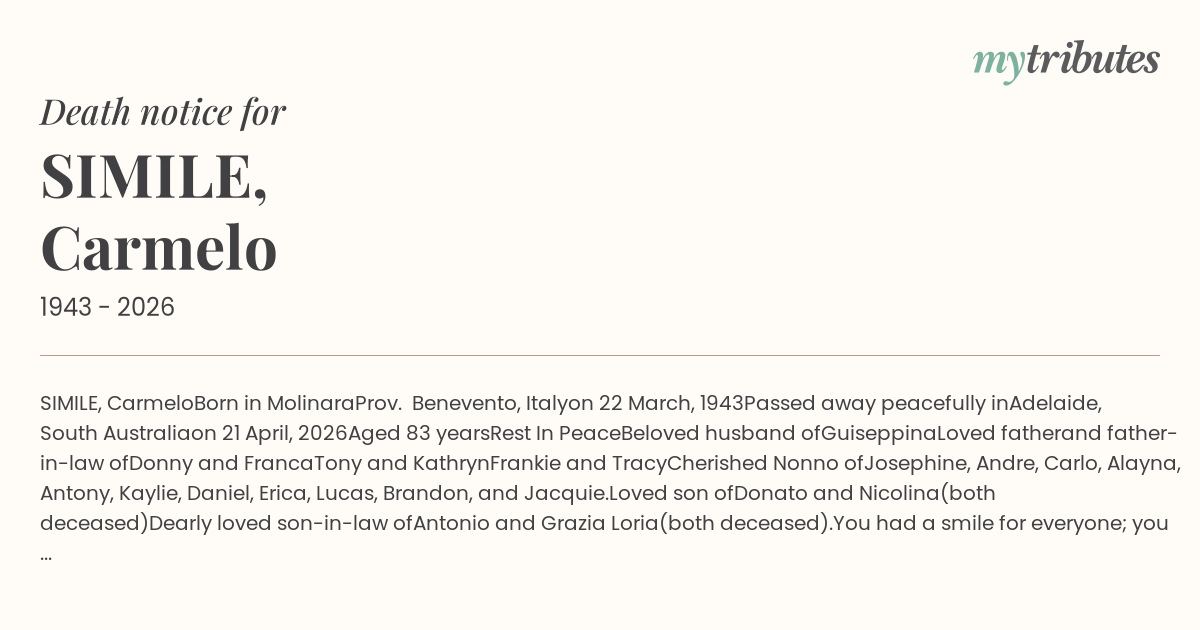 Carmelo will be loved and remembered by all his relatives and friends in Australia and