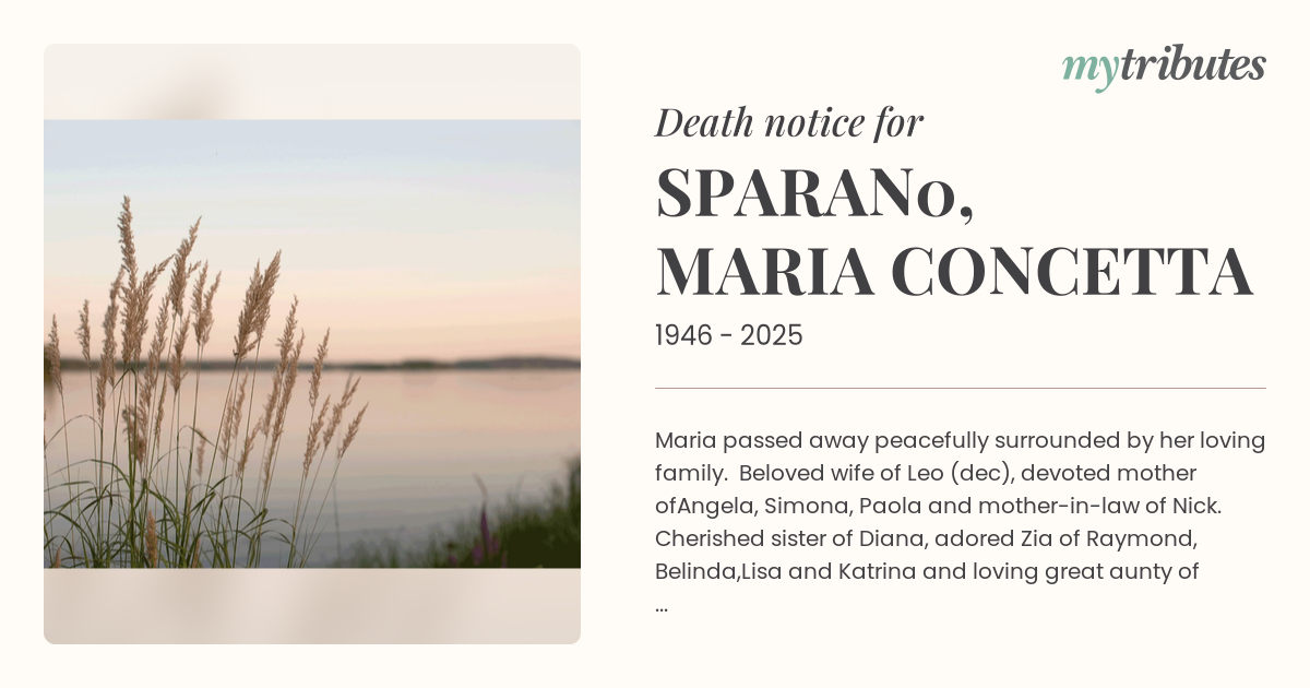 17°CMaria passed away peacefully surrounded by her loving family. Beloved wife of Leo (dec), devoted mother of