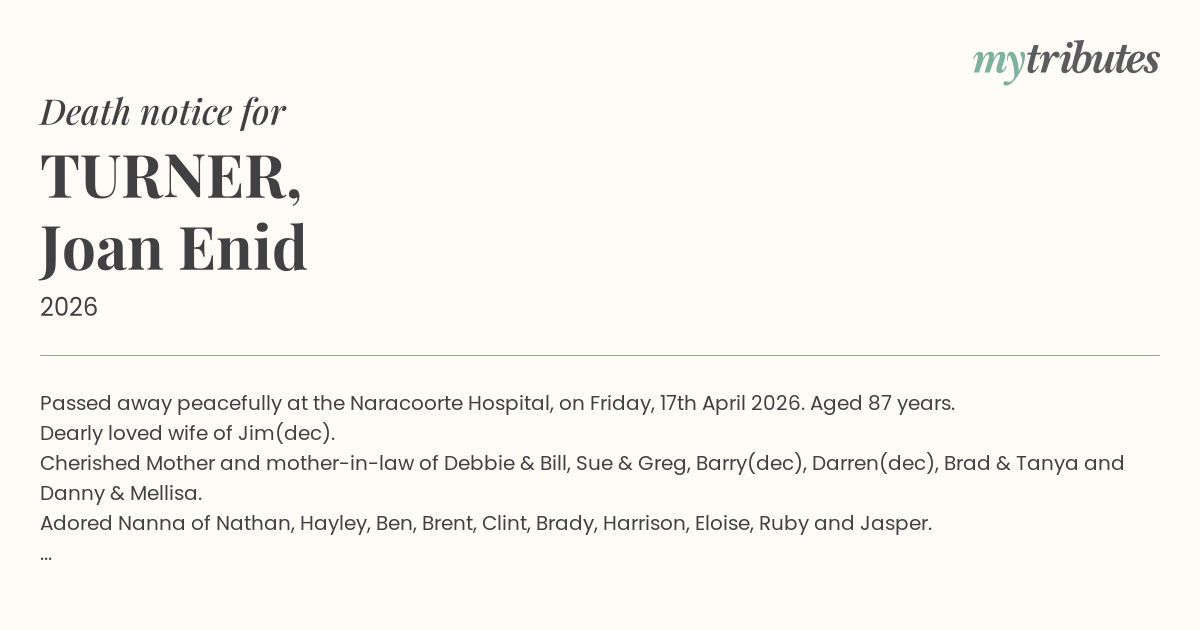 17°CPassed away peacefully at the Naracoorte Hospital, on Friday, 17th April 2026. Aged 87 years.