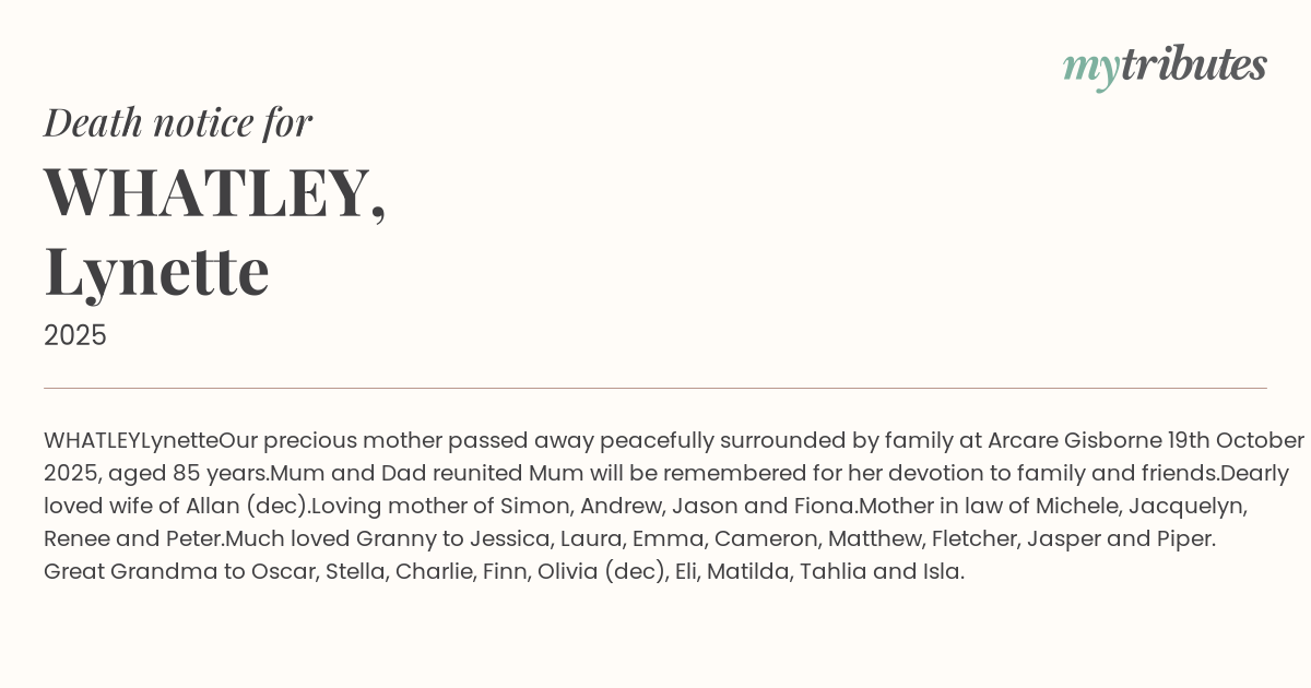 Much loved Granny to Jessica, Laura, Emma, Cameron, Matthew, Fletcher, Jasper and Piper.