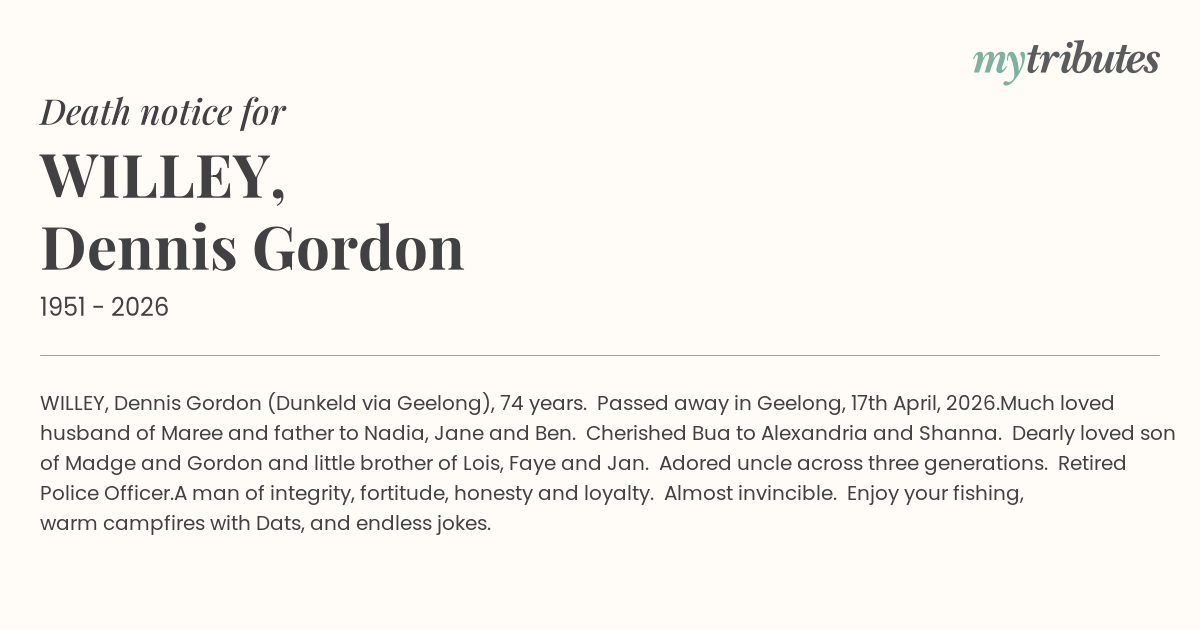 Passed away in Geelong, 17th April, 2026.