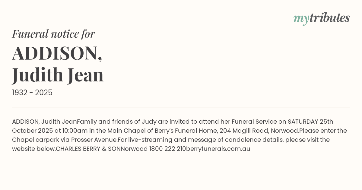 Family and friends of Judy are invited to attend her Funeral Service on SATURDAY 25th October 2025 at 10:00am in the Main Chapel of Berry's Funeral Home, 204 Magill Road, Norwood.