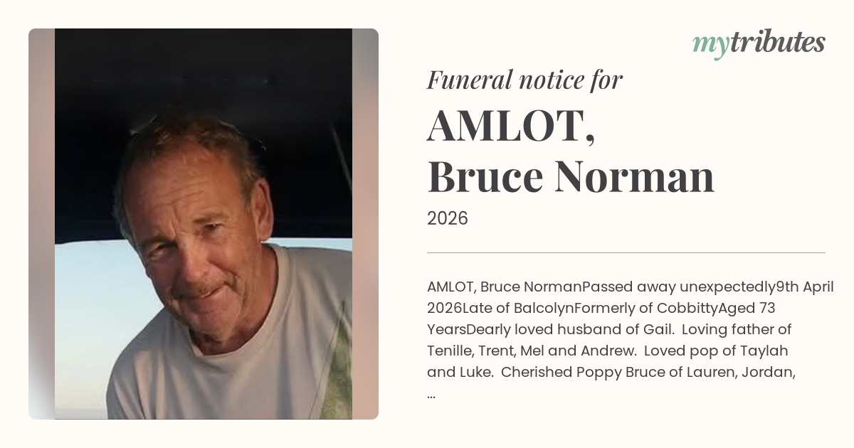 Dearly loved husband of Gail. Loving father of Tenille, Trent, Mel and Andrew. Loved pop of Taylah and Luke. Cherished Poppy Bruce of Lauren, Jordan, Holly, Millie, Paige, Jazmyn, Chelsie and Great Poppy B of Mia, Arlo, Paddy, Oakley and Oscar. Loved brother, nephew, cousin, brother-in-law and uncle.