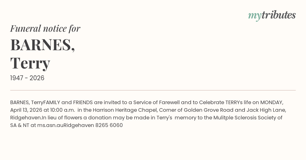 FAMILY and FRIENDS are invited to a Service of Farewell and to Celebrate TERRY’s life on