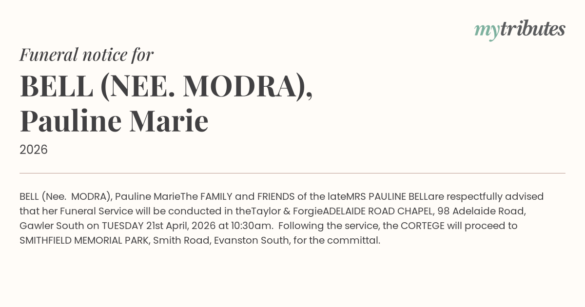 ADELAIDE ROAD CHAPEL, 98 Adelaide Road, Gawler South on TUESDAY 21st April, 2026 at 10:30am.