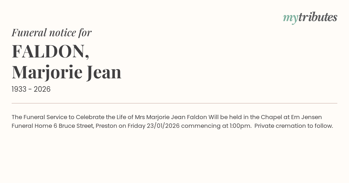 17°CThe Funeral Service to Celebrate the Life of Mrs Marjorie Jean Faldon Will be held in the Chapel at Ern Jensen Funeral Home 6 Bruce Street, Preston on Friday 23/01/2026 commencing at 1:00pm. Private cremation to follow.