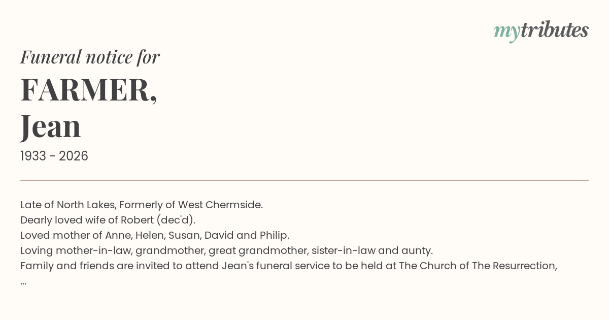 Family and friends are invited to attend Jean's funeral service to be held at The Church of The Resurrection, Ridley Road Bridgeman Downs on Monday 27th April 2026, at 10:30am.