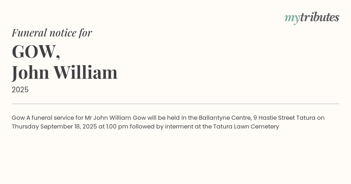 17°CGow A funeral service for Mr John William Gow will be held in the Ballantyne Centre, 9 Hastie Street Tatura on Thursday September 18, 2025 at 1.00 pm followed by interment at the Tatura Lawn Cemetery