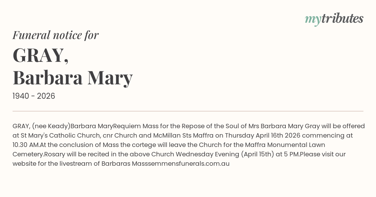 Mrs Barbara Mary Gray will be offered at St Mary's Catholic Church, cnr Church and McMillan Sts Maffra on Thursday April 16th 2026 commencing at 10.30 AM.