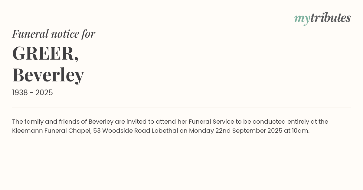 17°CThe family and friends of Beverley are invited to attend her Funeral Service to be conducted entirely at the Kleemann Funeral Chapel, 53 Woodside Road Lobethal on Monday 22nd September 2025 at 10am.