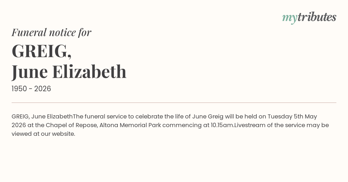 The funeral service to celebrate the life of June Greig will be held on Tuesday 5th May 2026 at the Chapel of Repose, Altona Memorial Park commencing at 10.15am.