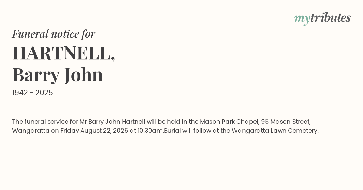 17°CThe funeral service for Mr Barry John Hartnell will be held in the Mason Park Chapel, 95 Mason Street, Wangaratta on Friday August 22, 2025 at 10.30am.
