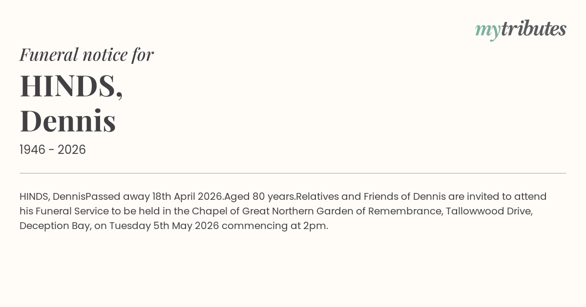 Relatives and Friends of Dennis are invited to attend his Funeral Service to be held in the Chapel of Great Northern Garden of Remembrance, Tallowwood Drive, Deception Bay, on Tuesday 5th May 2026 commencing at 2pm.