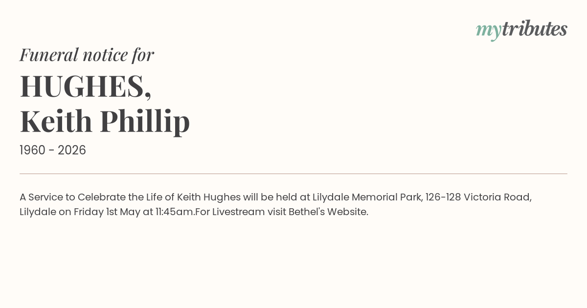17°CA Service to Celebrate the Life of Keith Hughes will be held at Lilydale Memorial Park, 126-128 Victoria Road, Lilydale on Friday 1st May at 11:45am.