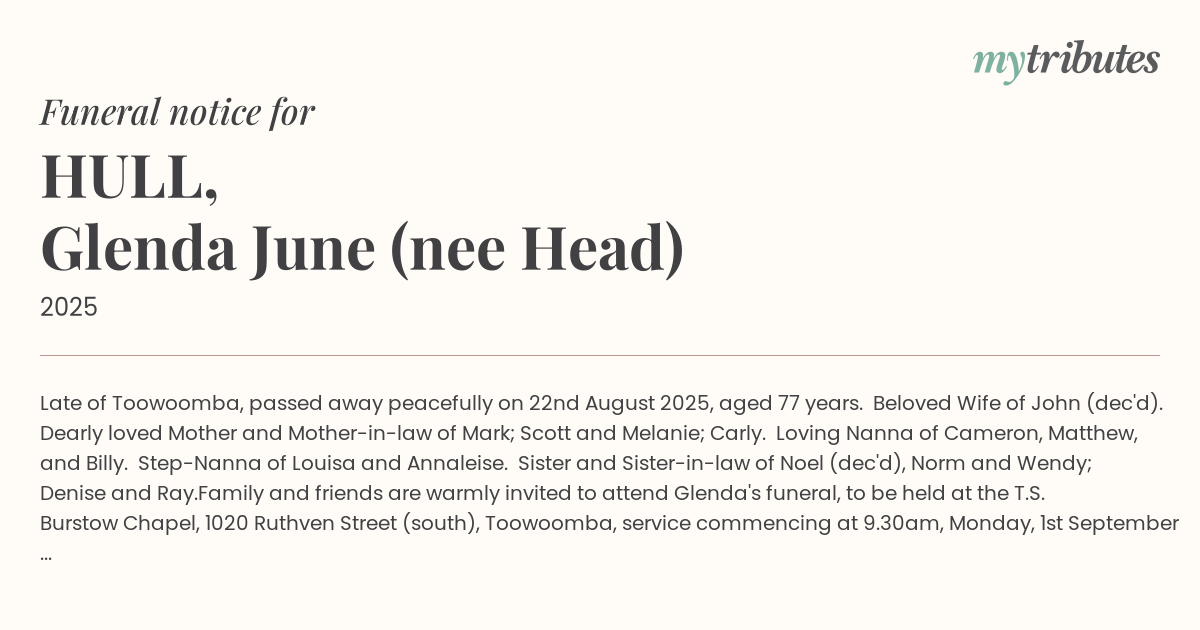 Family and friends are warmly invited to attend Glenda's funeral, to be held at the T.S. Burstow Chapel, 1020 Ruthven Street (south), Toowoomba, service commencing at 9.30am, Monday, 1st September 2025.