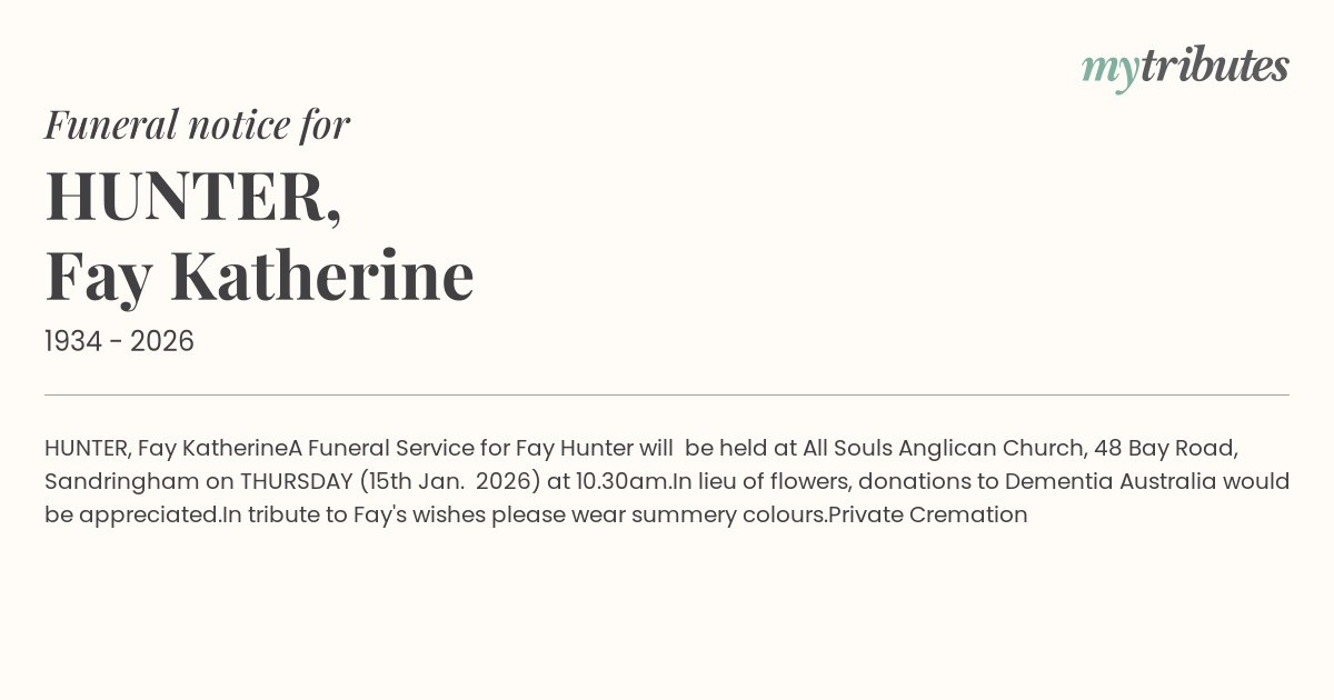 In lieu of flowers, donations to Dementia Australia would be appreciated.