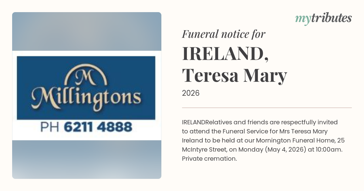 Relatives and friends are respectfully invited to attend the Funeral Service for Mrs Teresa Mary Ireland to be held at our Mornington Funeral Home, 25 McIntyre Street, on Monday (May 4, 2026) at 10:00am.