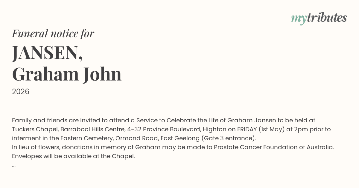 17°CFamily and friends are invited to attend a Service to Celebrate the Life of Graham Jansen to be held at Tuckers Chapel, Barrabool Hills Centre, 4-32 Province Boulevard, Highton on FRIDAY (1st May) at 2pm prior to interment in the Eastern Cemetery, Ormond Road, East Geelong (Gate 3 entrance).